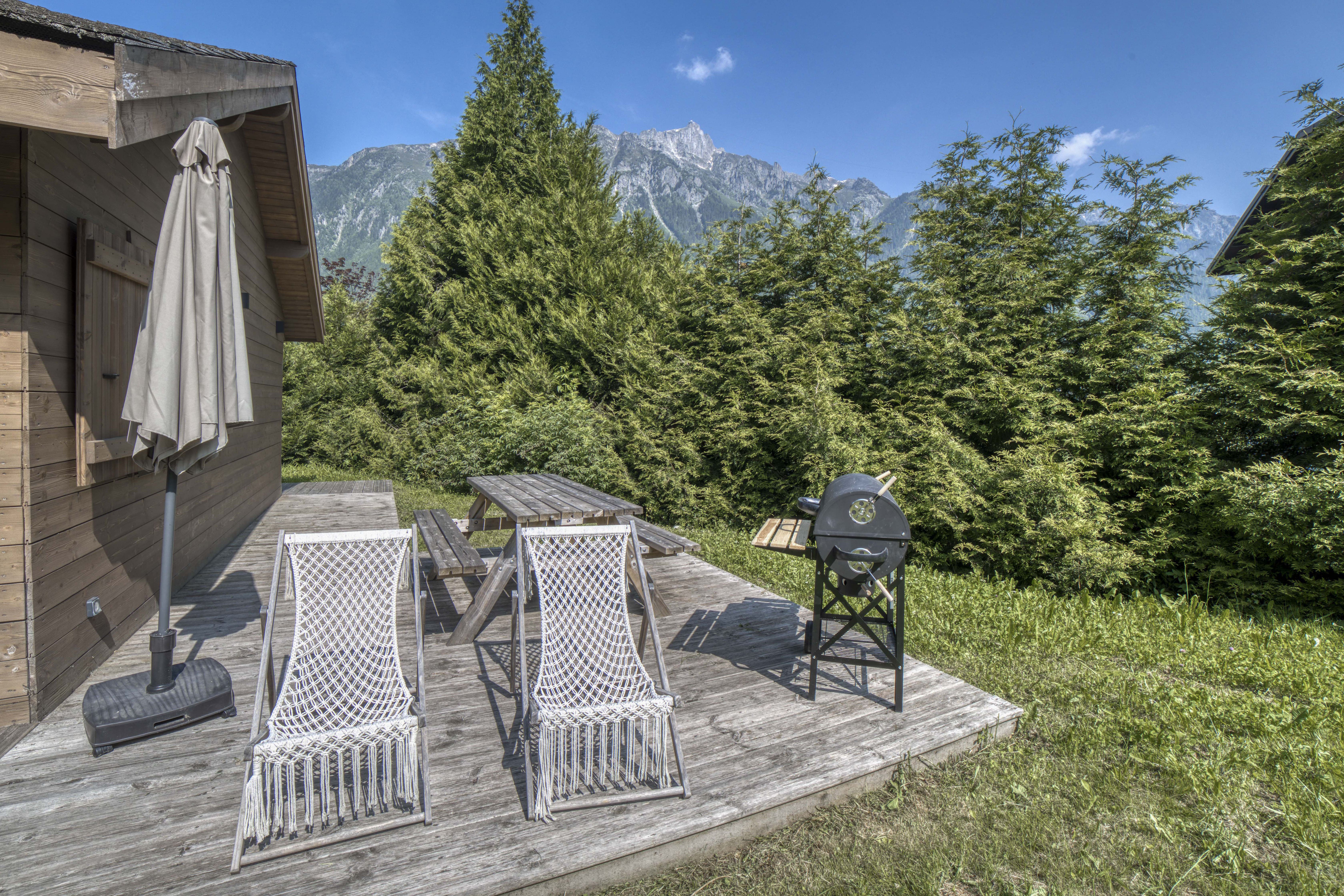 Chalet chaleureux à Chamonix pour 5 personnes, 2 chambres, 2 salles de bain, terrasse et jardin, idéal pour un séjour en famille.