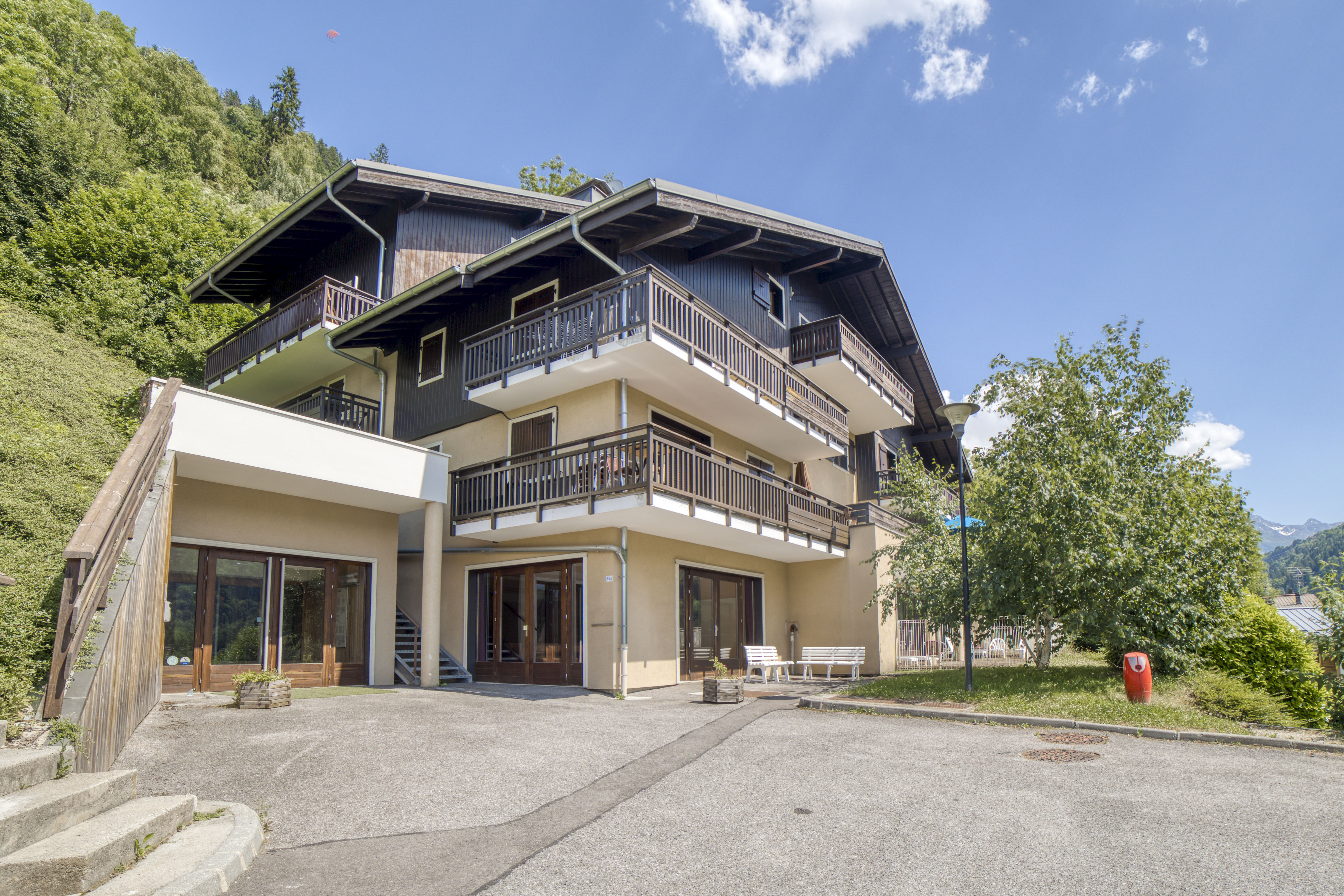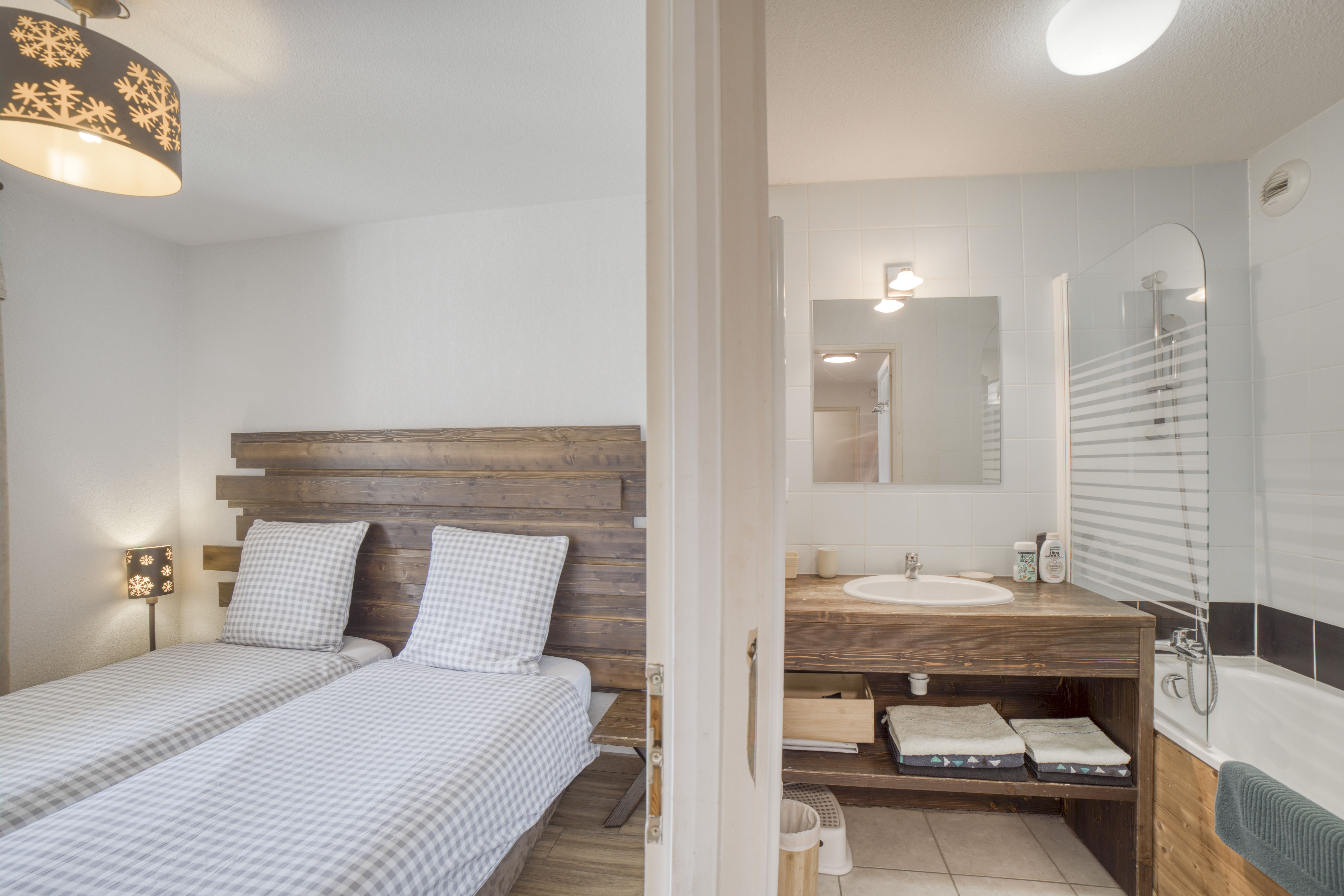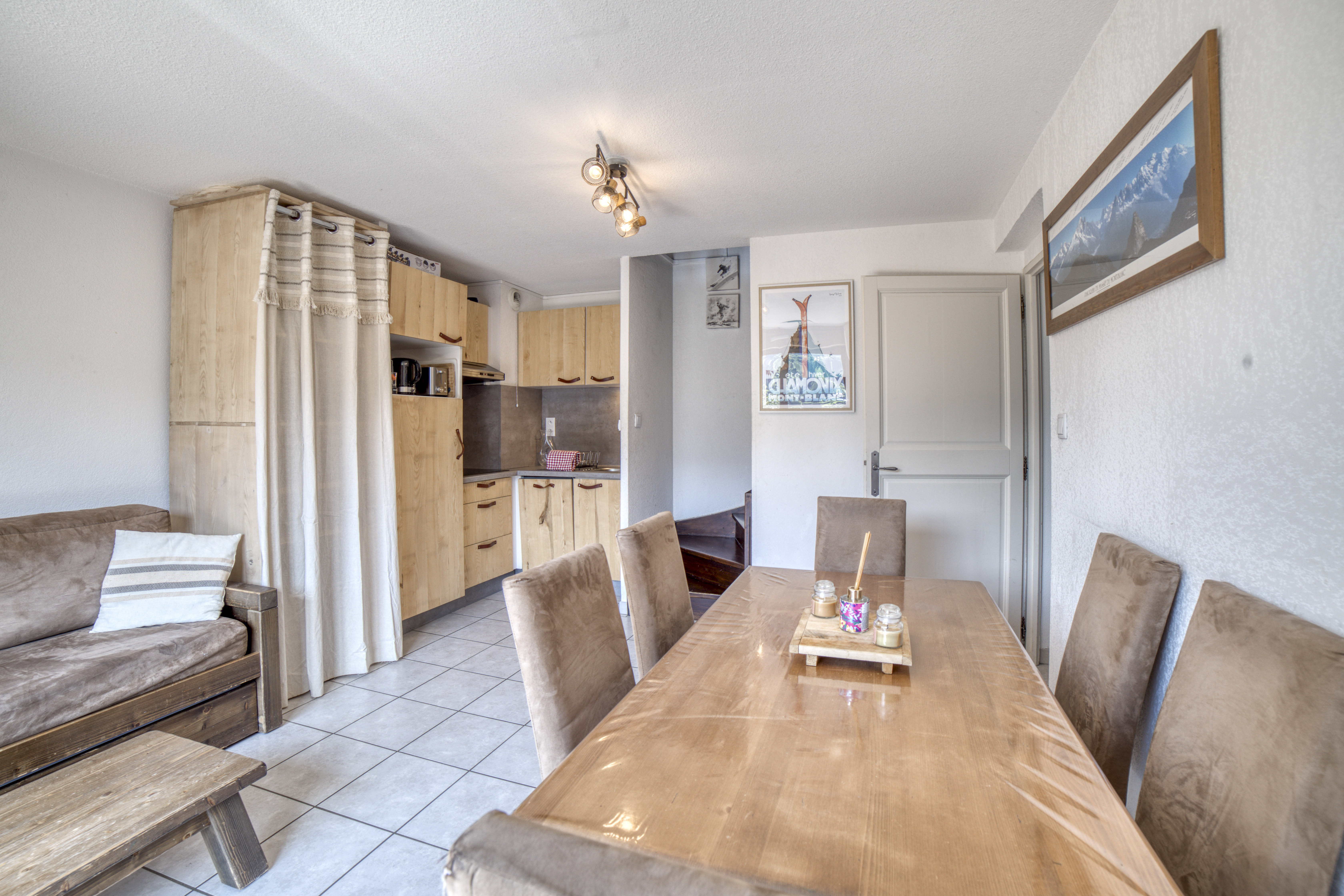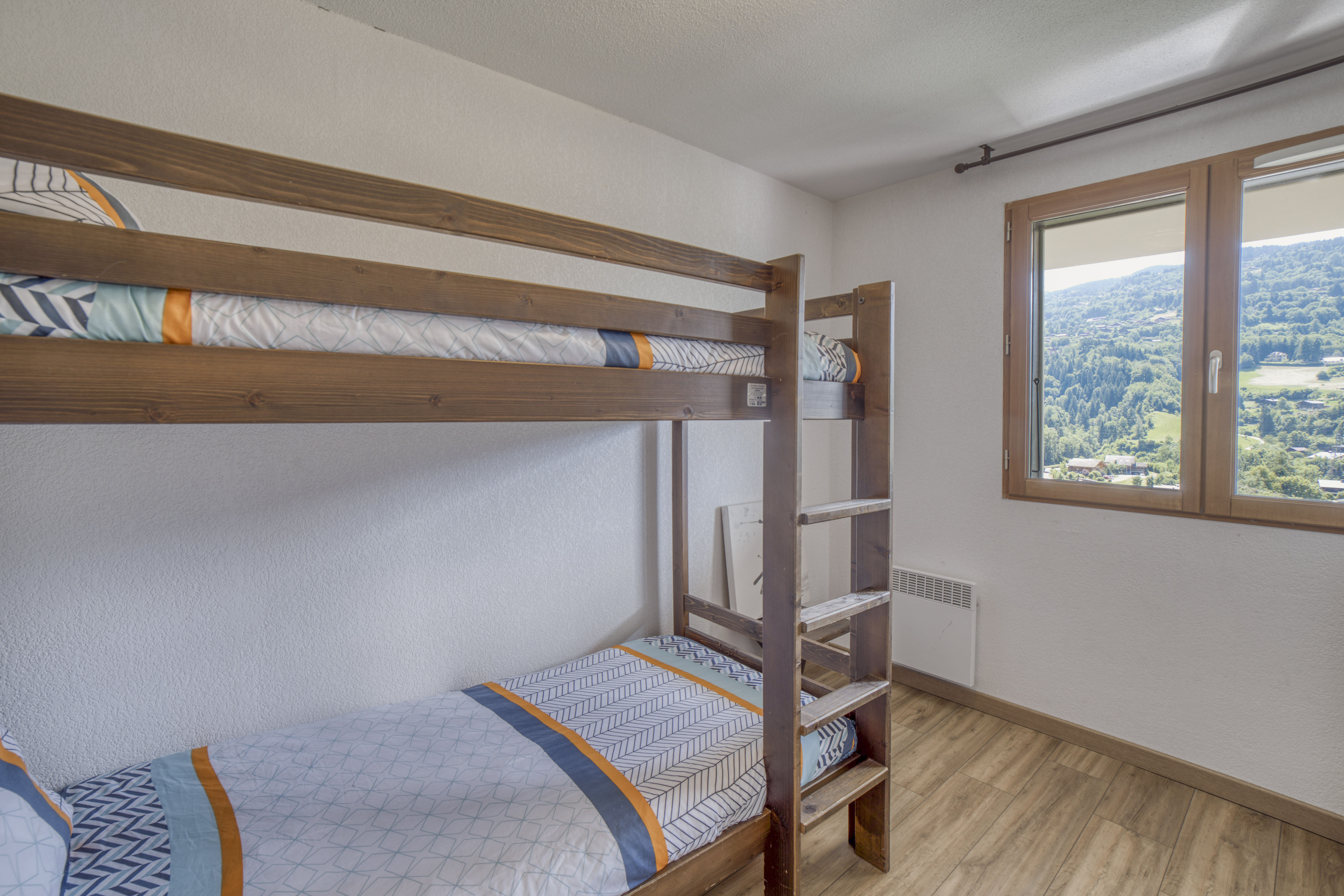 Duplex familial de 65 m² à Saint-Gervais-les-Bains, résidence calme avec piscine intérieure chauffée, 6 voyageurs, 3 chambres et 2 salles de bain.