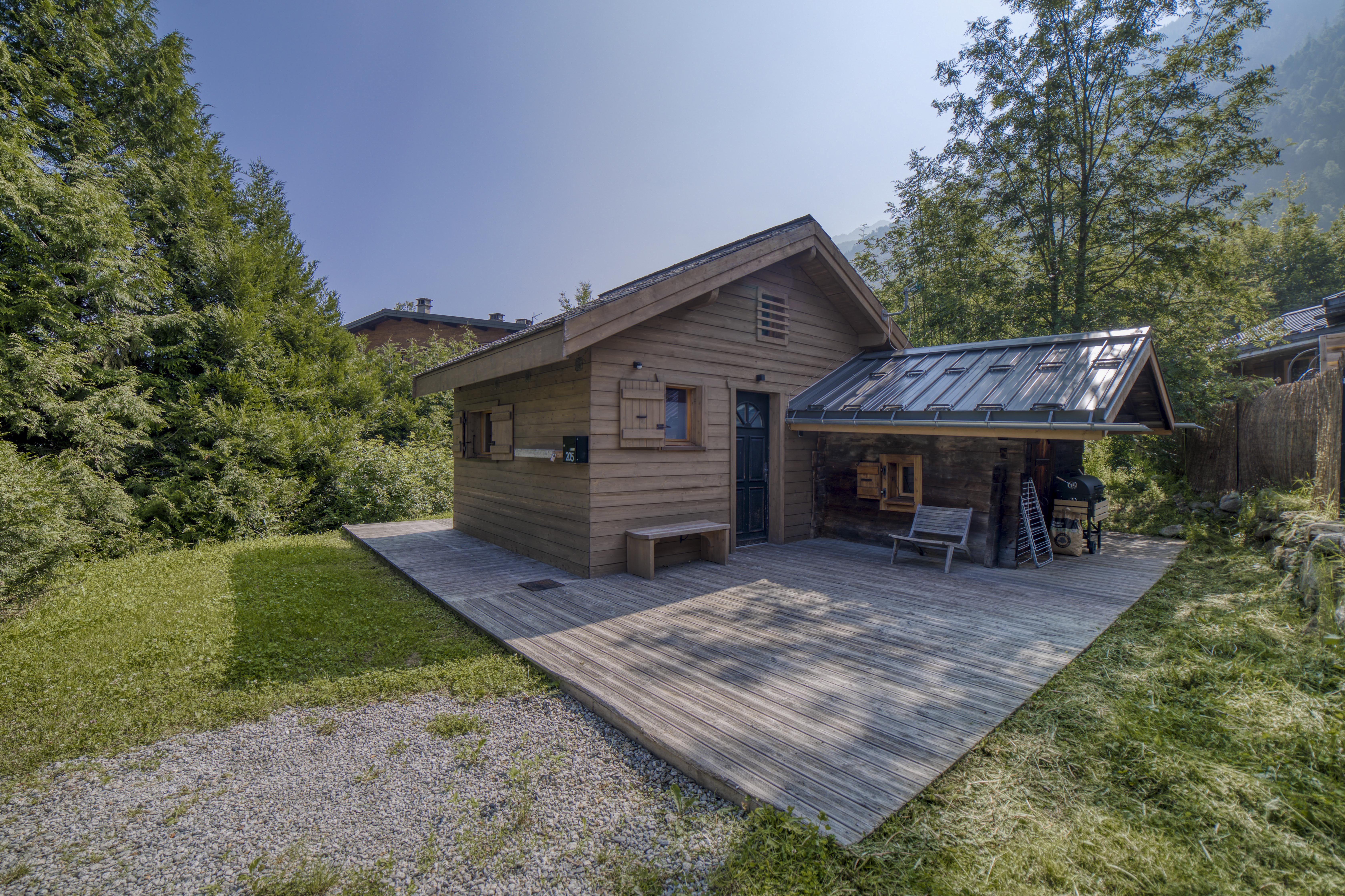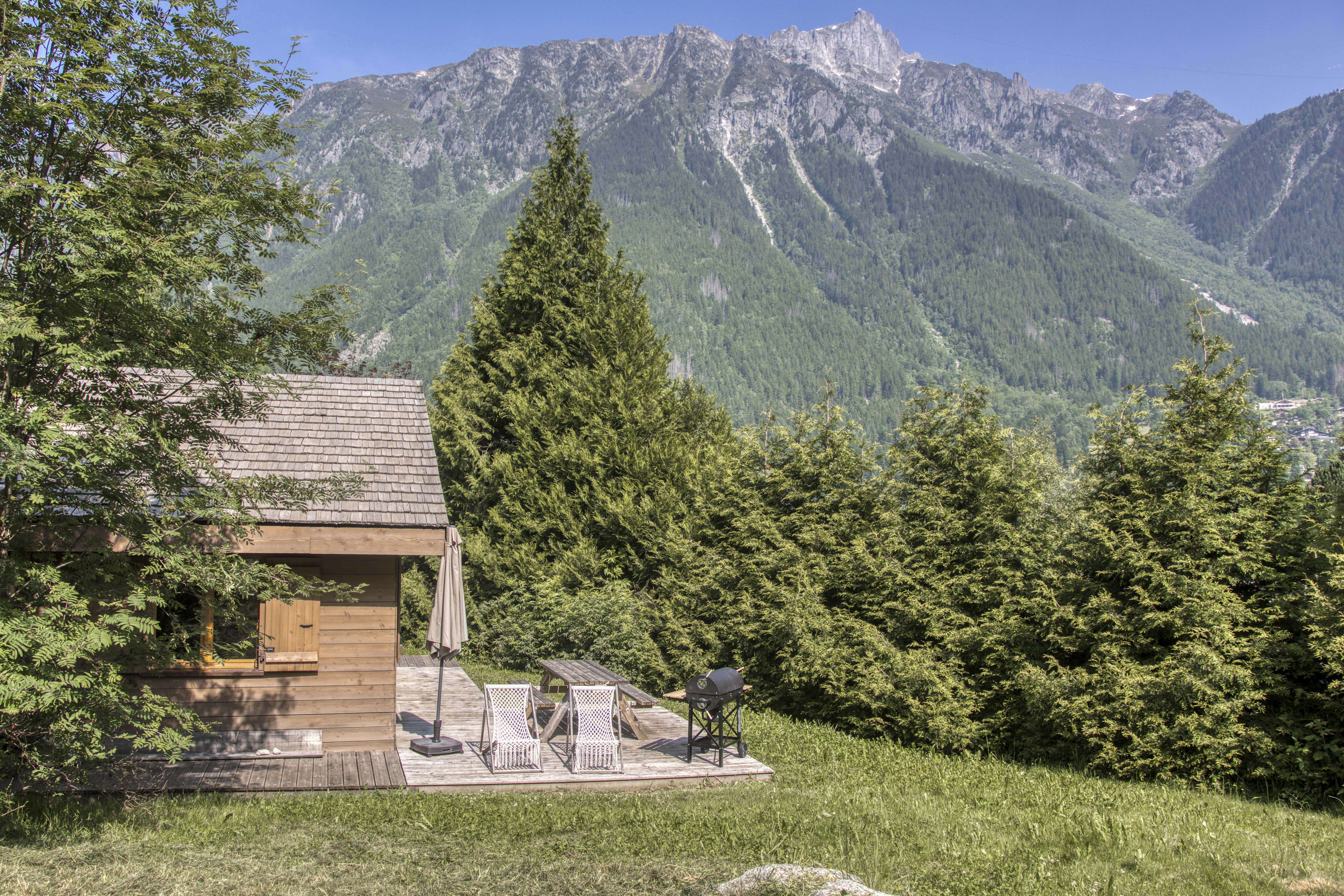 Chalet chaleureux à Chamonix pour 5 personnes, 2 chambres, 2 salles de bain, terrasse et jardin, idéal pour un séjour en famille.